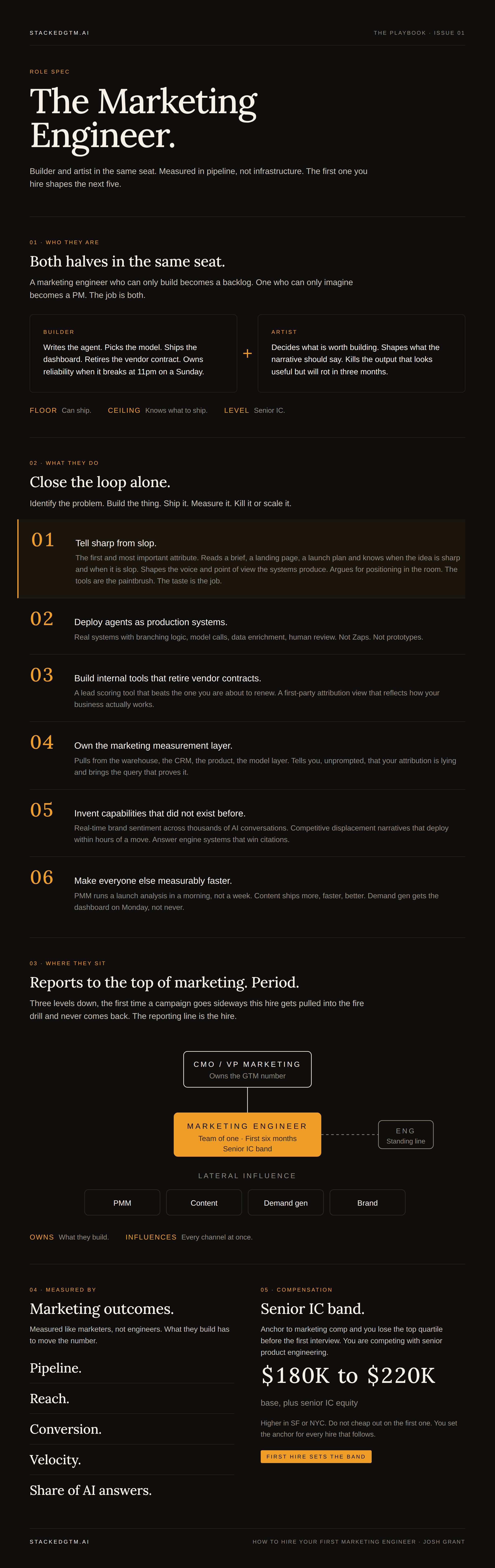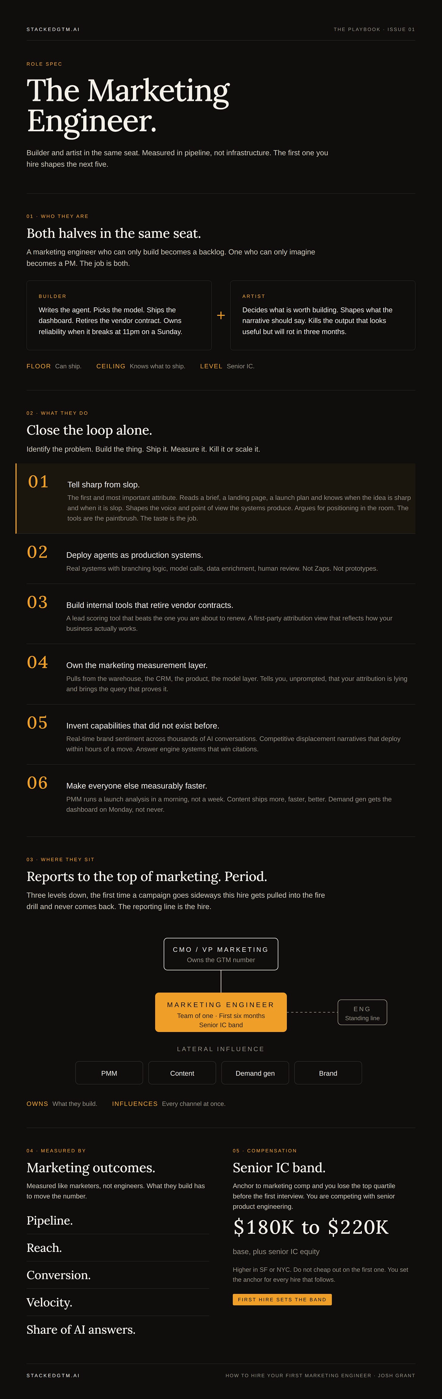 The role is builder and artist in the same seat. The builder half writes the agent, picks the model, ships the dashboard, retires the vendor contract. The artist half decides what is worth building, what the narrative needs to say, and whether the output is any good. Neither half works alone. A marketing engineer who can only build becomes a backlog. One who can only imagine becomes a PM. The job is both, and the people who do it well are rarer than the title makes it sound.